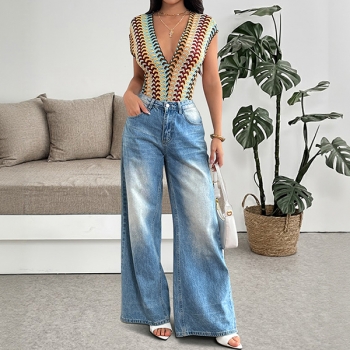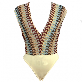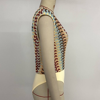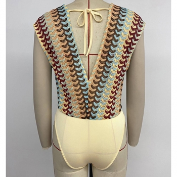 70s Retro-Boho Multicolor Wave Open-knit Plunging V-Neck Cap Sleeve Bodysuit