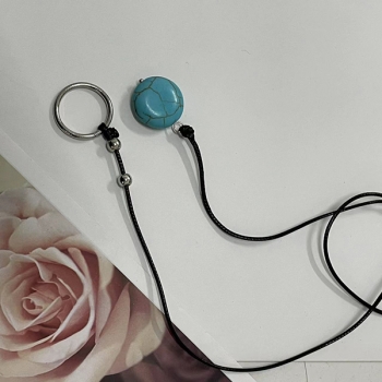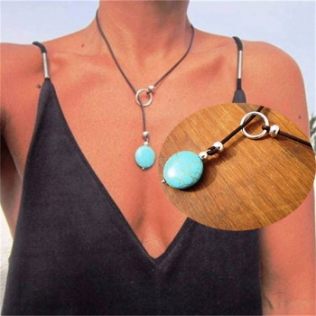 Boho Turquoise Pendant Lariat Necklace - Minimalist Black Leather Cord Y-Necklace with Silver Ring