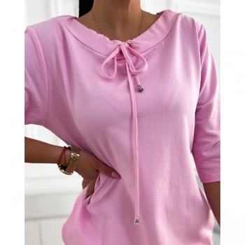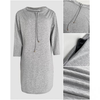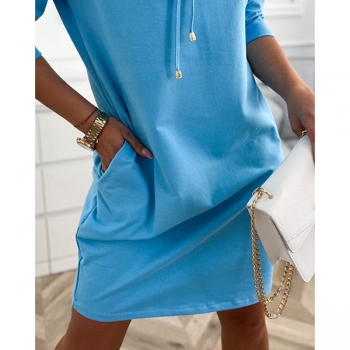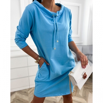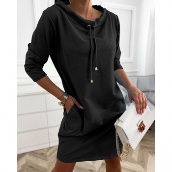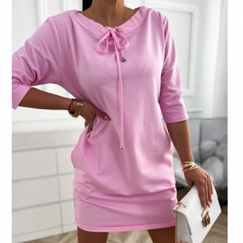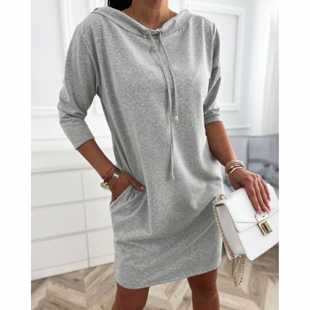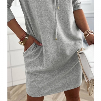 Casual Solid Color Drawstring Crew Neck Elbow-sleeve Side Pockets Sweatshirt Dress