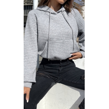 Casual Solid Color Long Sleeve Drawstring Hooded Waffle Texture Crop Sweatshirt