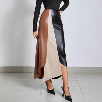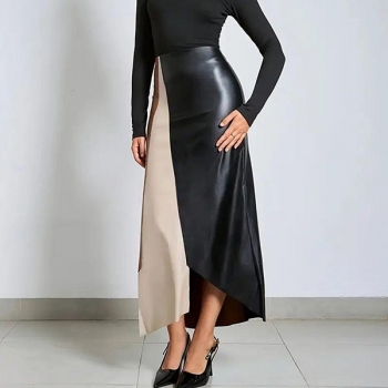 Fashion Contrast Color High-rise Irregular Hemline Artificial Leather PU Skirt