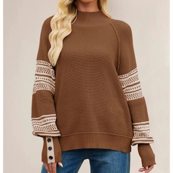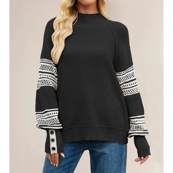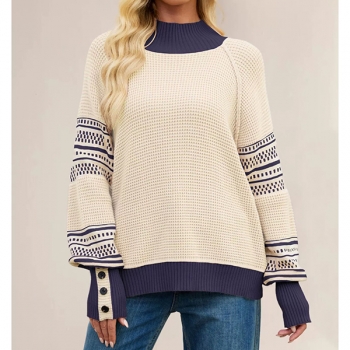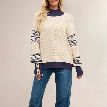 Fashion Crew Neck Batwing Long Sleeve Contrast Color Printed Knitted Sweater