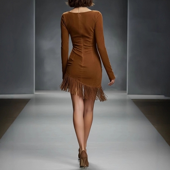 Fashion Crew Neck Long Sleeve Tassle Hemline Bodycon Mini Dress
