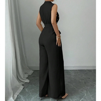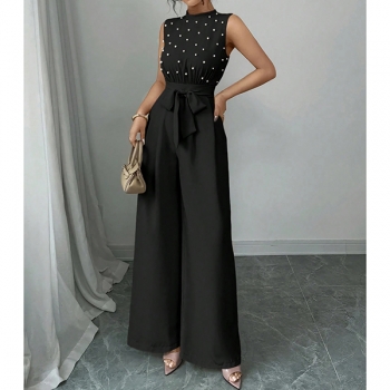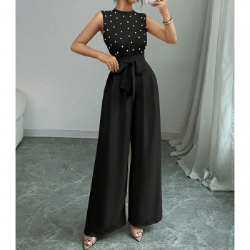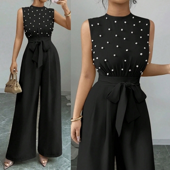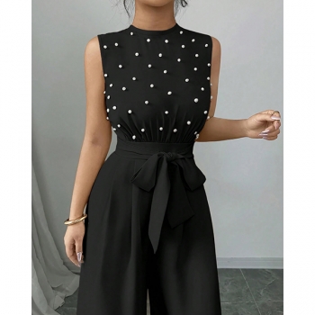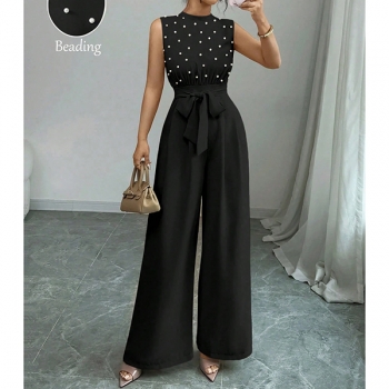 Fashion Crew Neck Sleeveless Beaded High-rise Self-tie Waist Wide-leg Jumpsuit