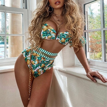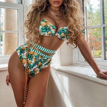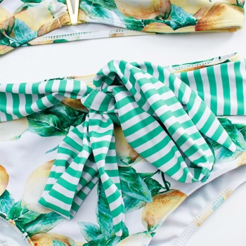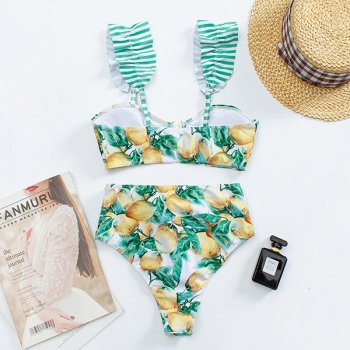 Fashion High Waist Floral Printed Ruffle Tie-belt Bikini Set