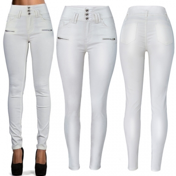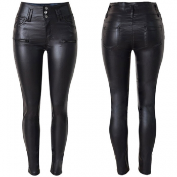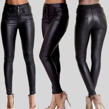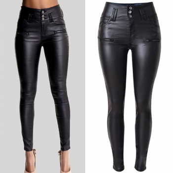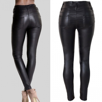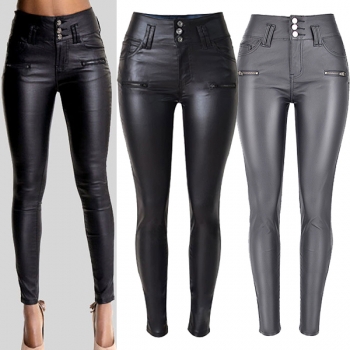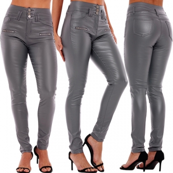 Fashion High-Waist Slim Fit Stretch PU Artificial Leather Gray Pants