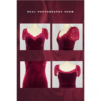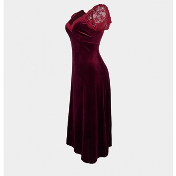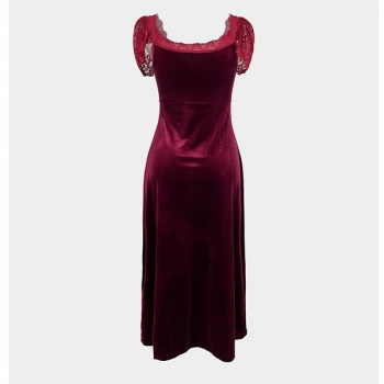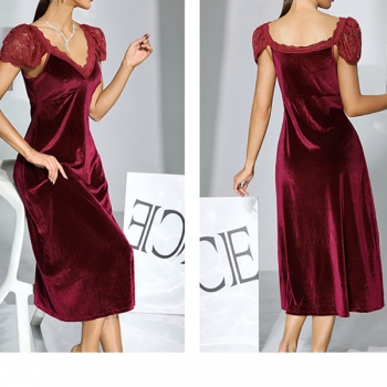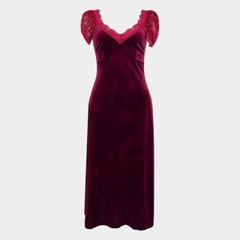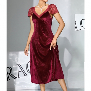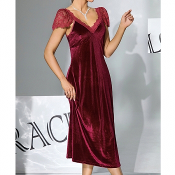 Fashion Lace Spliced V-neck Cap Sleeve Velvet Nightwear Dress