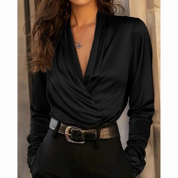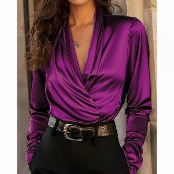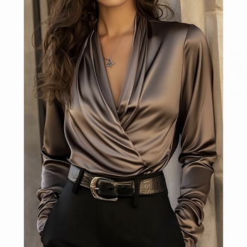 Fashion Ruched V-neck Long Sleeve Satin Shirt