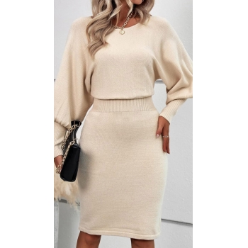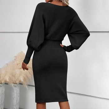 Fashion Solid Color Crew Neck Batwing Long Sleeve Elastic Waist Bodycon Sweater Dress