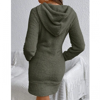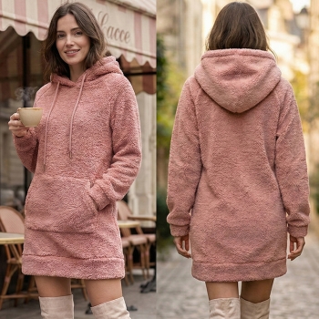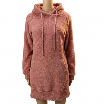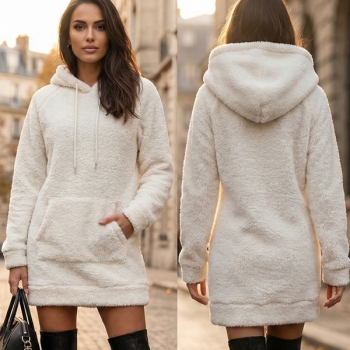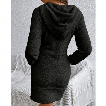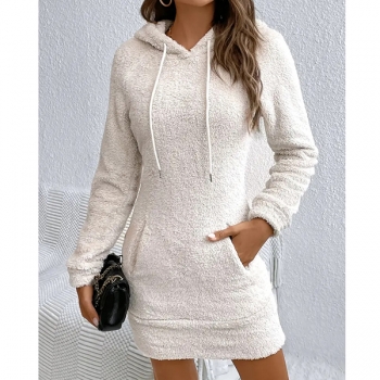 Fashion Solid Color Long Sleeve Kangaroo Pockets Drawstring Hooded Plush Dress