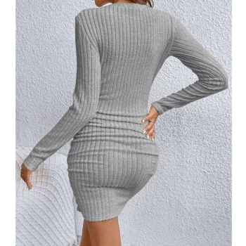Fashion Solid Color V-neck Long Sleeve Ribbed Bodycon Dress