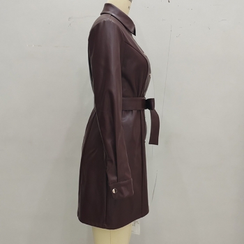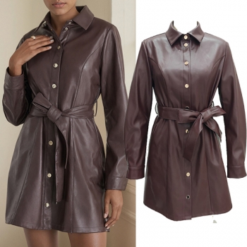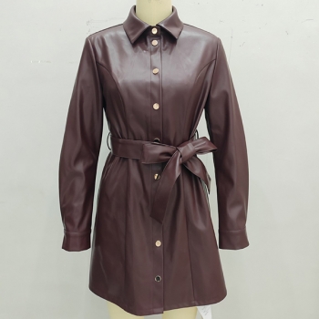 Fashion Stand Collar Long Sleeve Front Button Self-tie Artificial Leather PU Jacket