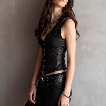 Fashion V-neck Front Button Sleeveless Artificial Leather PU Shirt