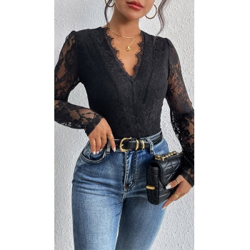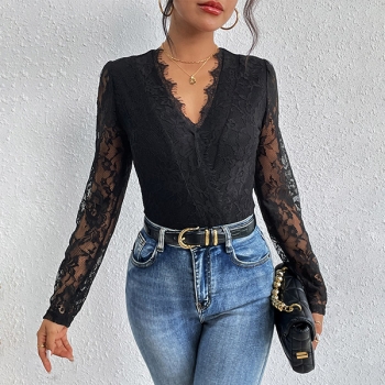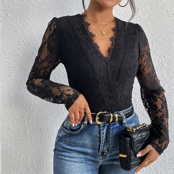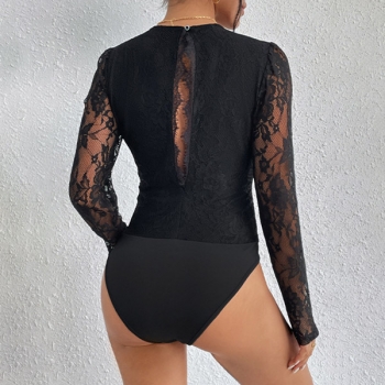 Fashion V-neck Long Sleeve Lace Bodysuit