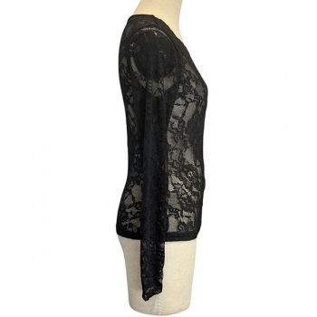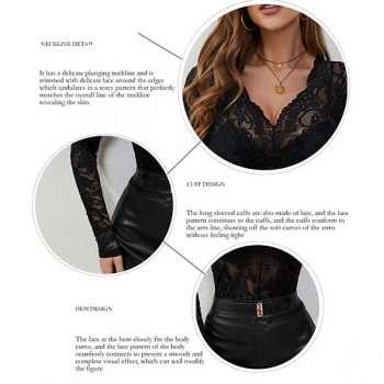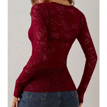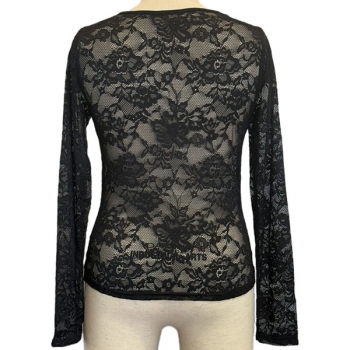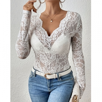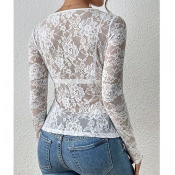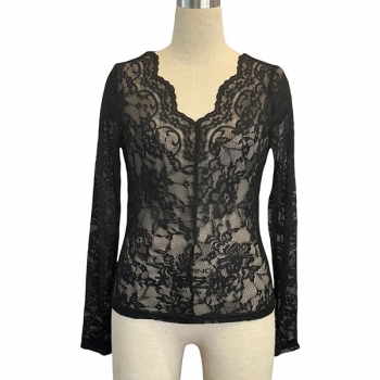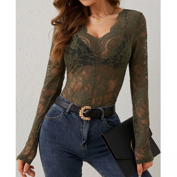 Fashion V-neck Long Sleeve Semi-through Lace Shirt