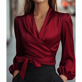 Fashion V-neck Puff Long Sleeve Self-tie Satie Shirt