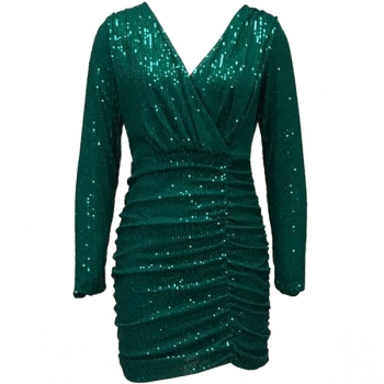 Sexy Bling-bling Sequined V-neck Long Sleeve Irregular Hemline Ruched Bodycon Party Dress