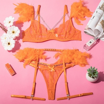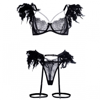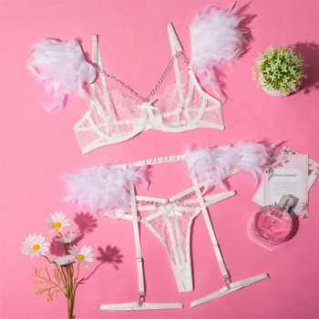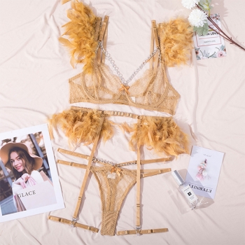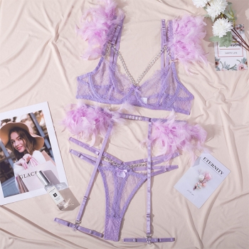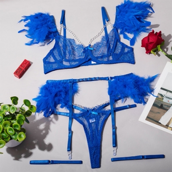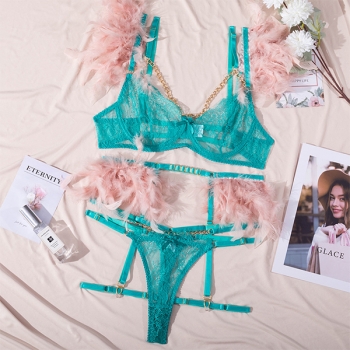 Sexy Feather Spliced Lace Chain Three-piece Lingerie Set