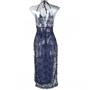Sexy Halter Neck Side Slit Backless Floral Jacquard Semi-through Lace Nightwear Dress