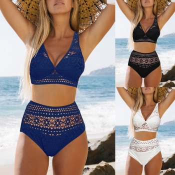 Sexy Lace Spliced Floral Cutout Bikini Set Consist of Bikini Top +High Waist Bikini Bottoms