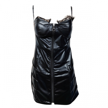 Sexy Lace Spliced Strapless Front-zipper Slim Fit PU Leather Dress