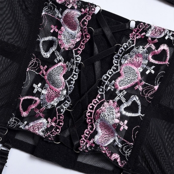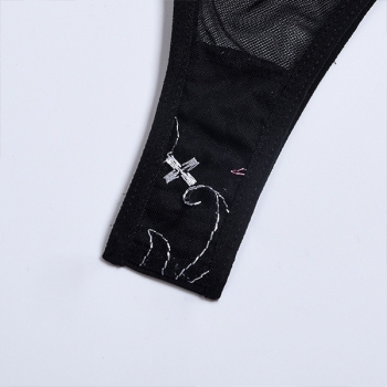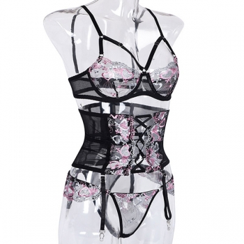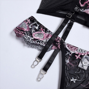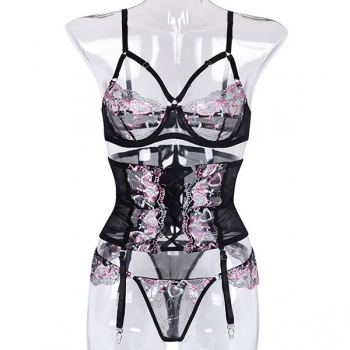 Sexy See-through Gauze Heart Embroidery Lingerie Three-piece Set