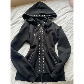 Street Fashion Drawstring Hooded Long Sleeve Front Zipper Rivet Sweatshirt