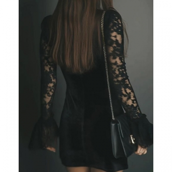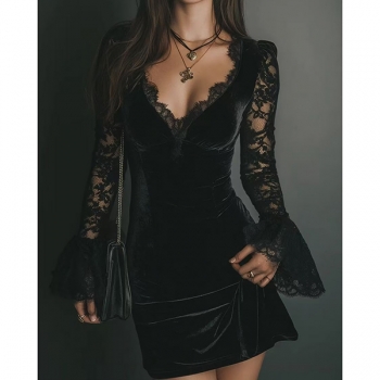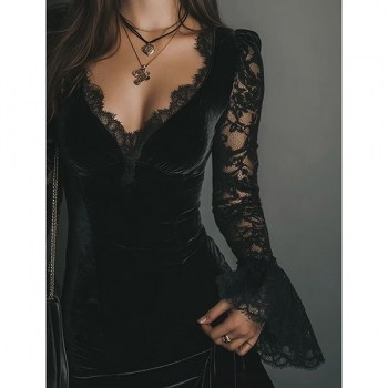 Vintage-Inspired Velvet V-neck Mini Dress - Sheer Lace Sleeves & Flared Cuffs