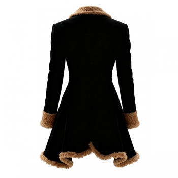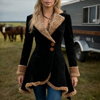 Vintage Notch Lapel Long Sleeve Button Irregular Hemline Plush Lined Jacket