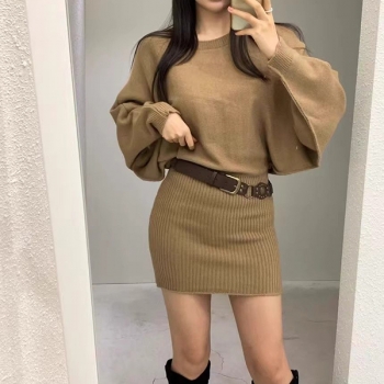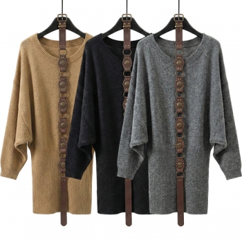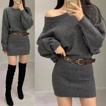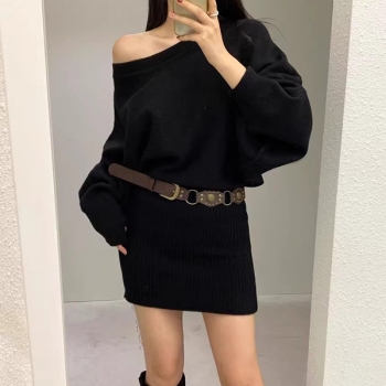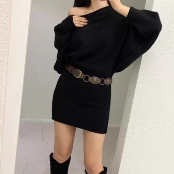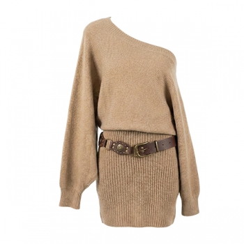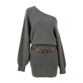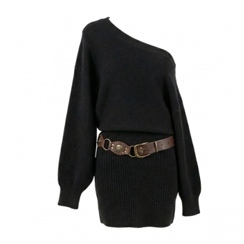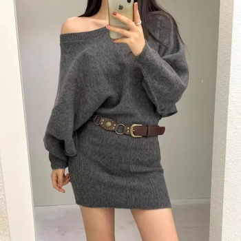 Women's Asymmetric Slant Neckline Sweater Dress - Long Sleeve Batwing Bodycon with Belt