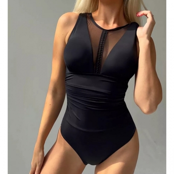 Women's Black High Neck One-Piece Swimsuit with Mesh Panel, Ruched Tummy Control & Backless