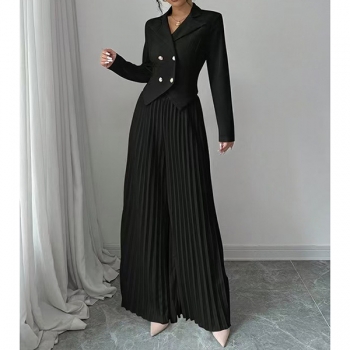 Women's Two-piece Suit Set Consist of Double-breasted Crop Blazer and Pleated Wide-leg Pants